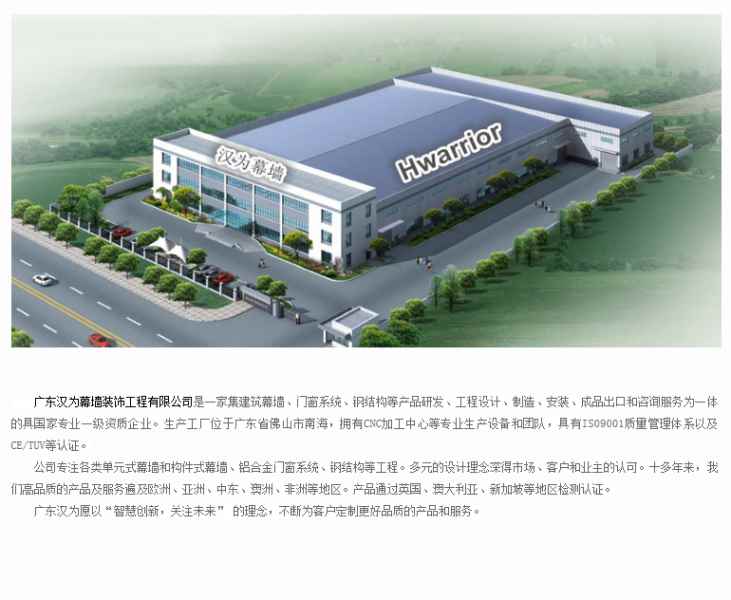 | 廣東漢為幕墻裝飾工程有限公司是一家集建筑幕墻、門窗系統、鋼結構等產品研發、工程設計、制造、安裝、成品出口和咨詢服務為一體的具國家專業一級資質企業。生產工廠位于廣東省佛山市南海,擁有CNC加工中心等專業生產設備和團隊,具有IS09001質量管理體系以及CE/TUV等認證。 公司專注各類單元式幕墻和構件式幕墻、鋁合金門窗系統、鋼結構等工程。多元的設計理念深得市場、客戶和業主的認可。十多年來,我們高品質的產品及服務遍及歐洲、亞洲、中東、澳洲、非洲等地區。產品通過英國、澳大利亞、新加坡等地區檢測認證。 廣州漢為愿以“智慧創新,關注未來” 的理念,不斷為客戶定制更好品質的產品和服務。 |